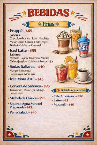 Y para acompañar, pregunta por la disponibilidad de refrescos o complementa tu pedido con nuestras bebidas frías y calientes: frappés de sabores originales, iced lattes, sodas italianas, cervezas de sabores y clásicos como café americano o latte.
