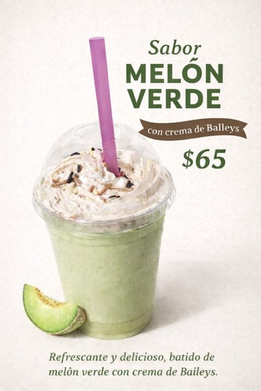 Un batido único que mezcla la dulzura del melón verde con la suavidad de la crema de Baileys, coronado con crema batida y chispas de chocolate. Refrescante, cremoso y perfecto para quienes buscan un postre líquido que cierre con broche de oro su pedido.