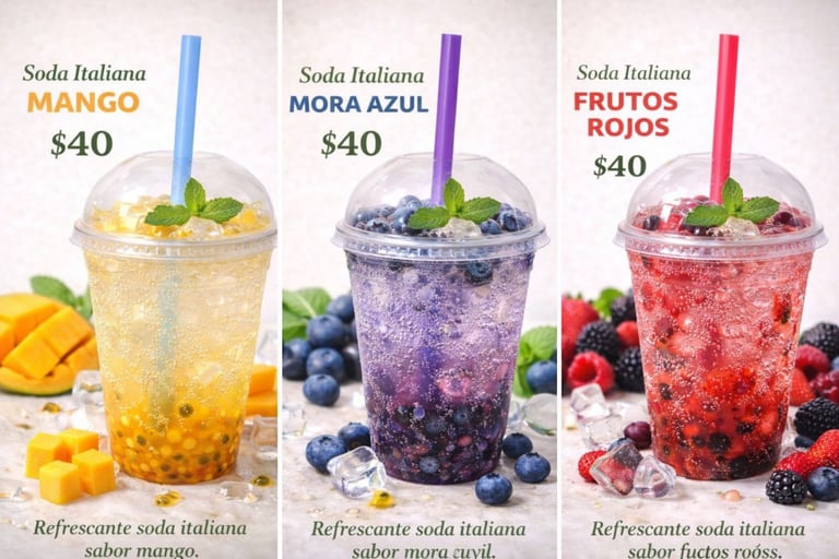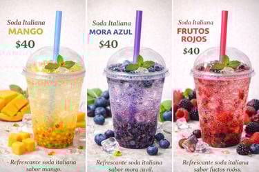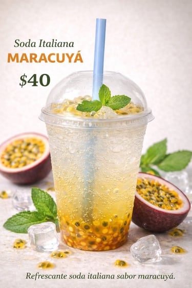 Las Sodas Italianas son la explosión de frescura que estabas esperando. Disponibles en sabores mango, maracuyá, frutos rojos y mora azul, cada vaso está lleno de color, fruta natural y burbujas que conquistan el paladar. Perfectas para darle un giro gourmet a tu pedido de alitas o boneless.