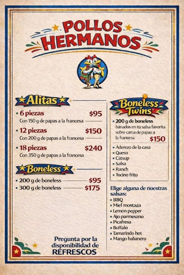 "Disfruta en Pollos Hermanos las mejores alitas, boneless y Boneless Twins con papas y salsas irresistibles. Acompaña tu comida con frappés, lattes, sodas italianas y cervezas de sabores. ¡Sabor único en Real Castilla, Atotonilco de Tula!"